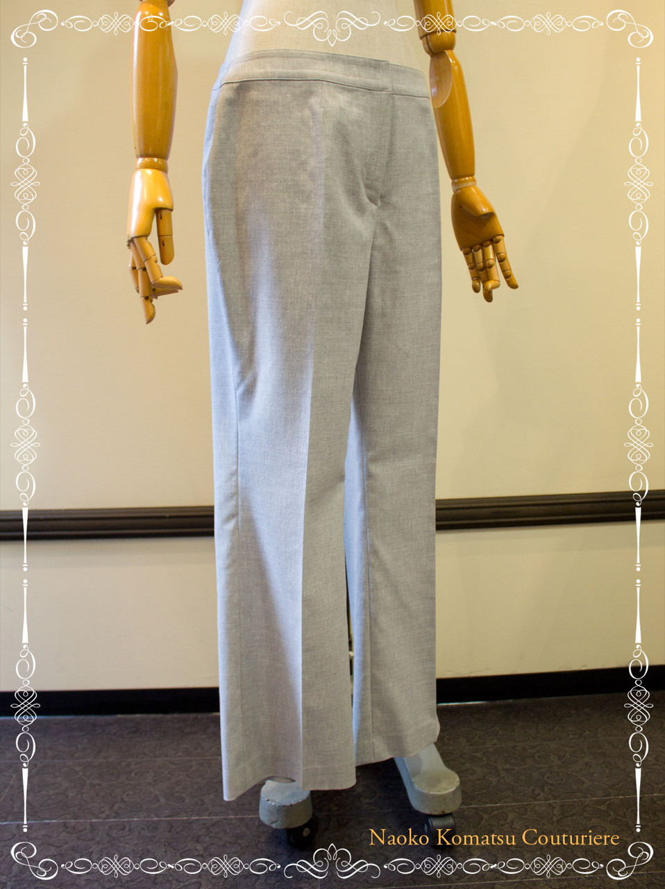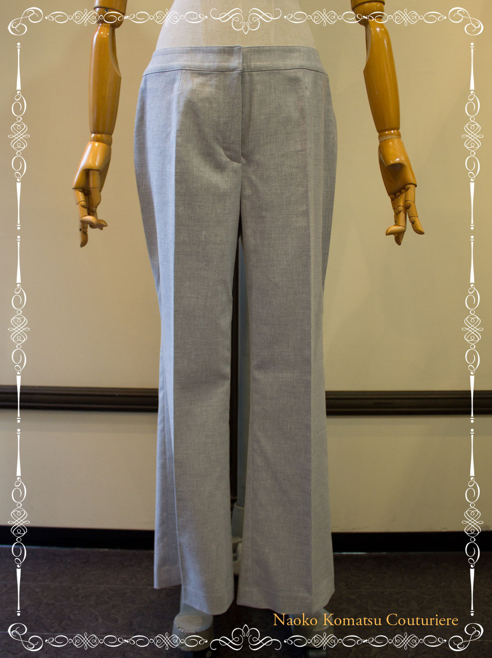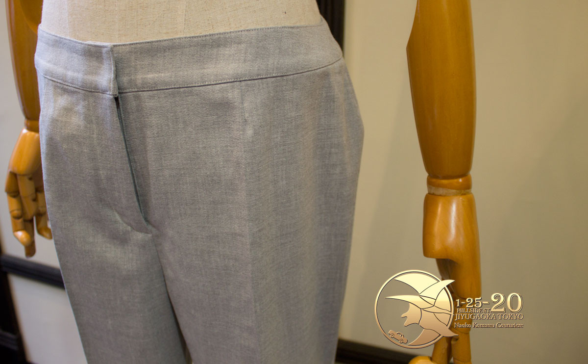 お客様のご希望で脇ポケットも玉縁も ファスナー以外何もついていないパンツなのです!