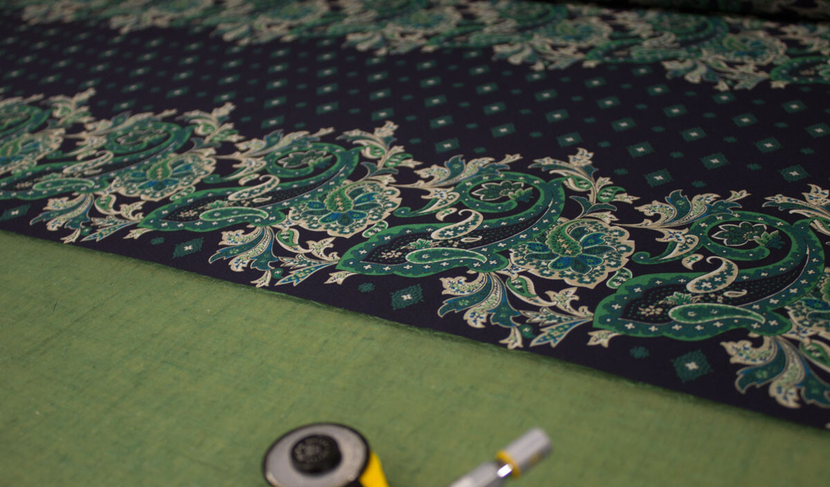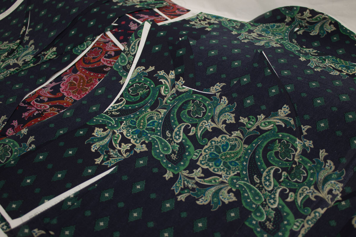 以前製作したシャーリングワンピースの着丈・柄合わせなどを変更して製作しました。