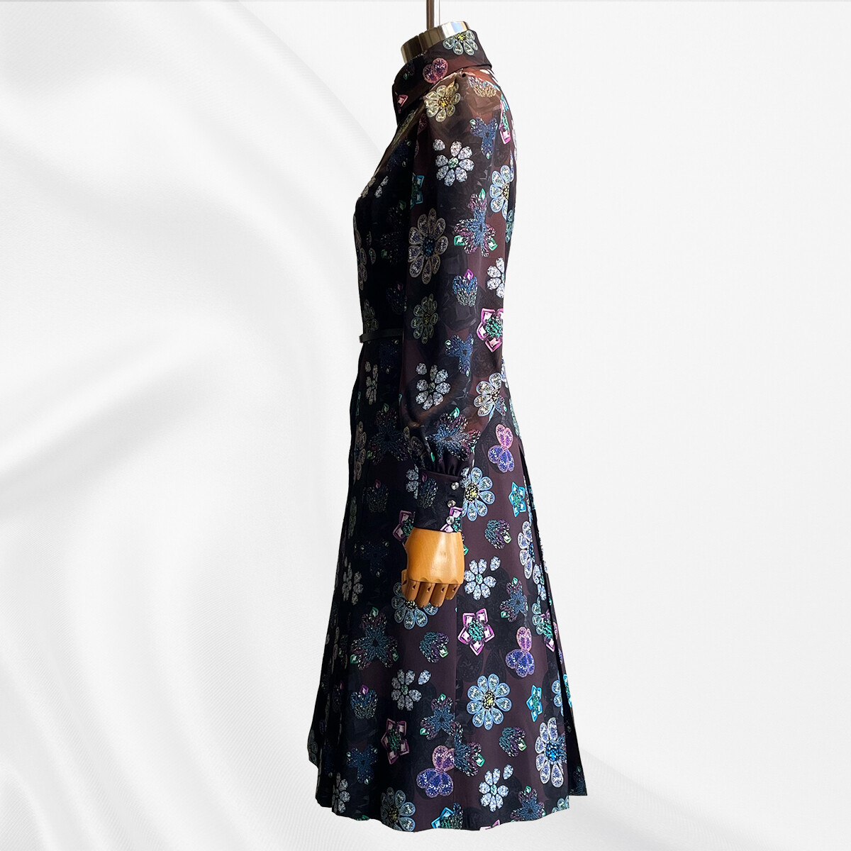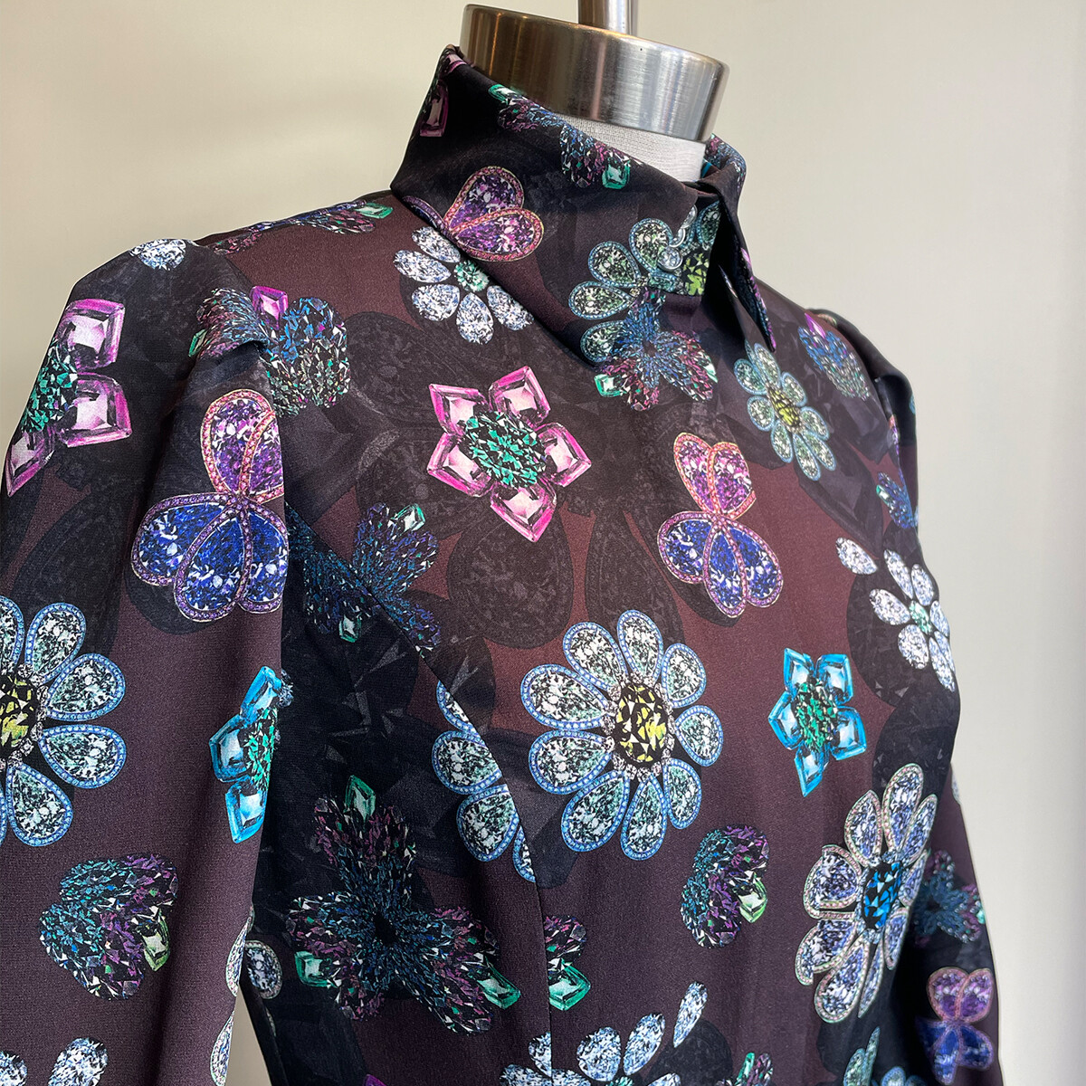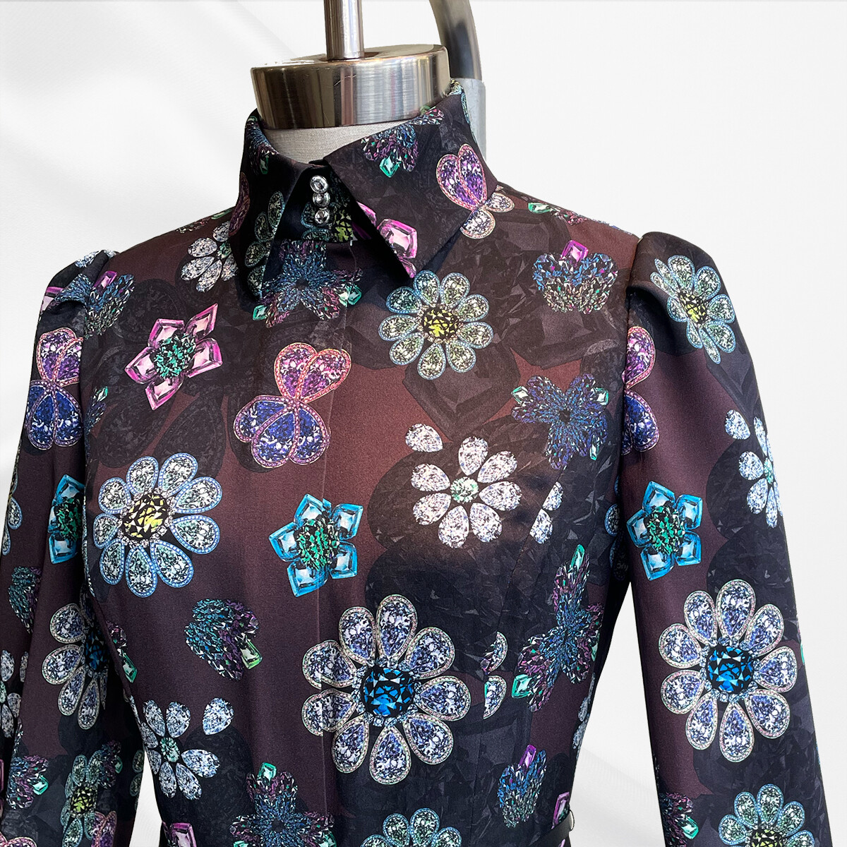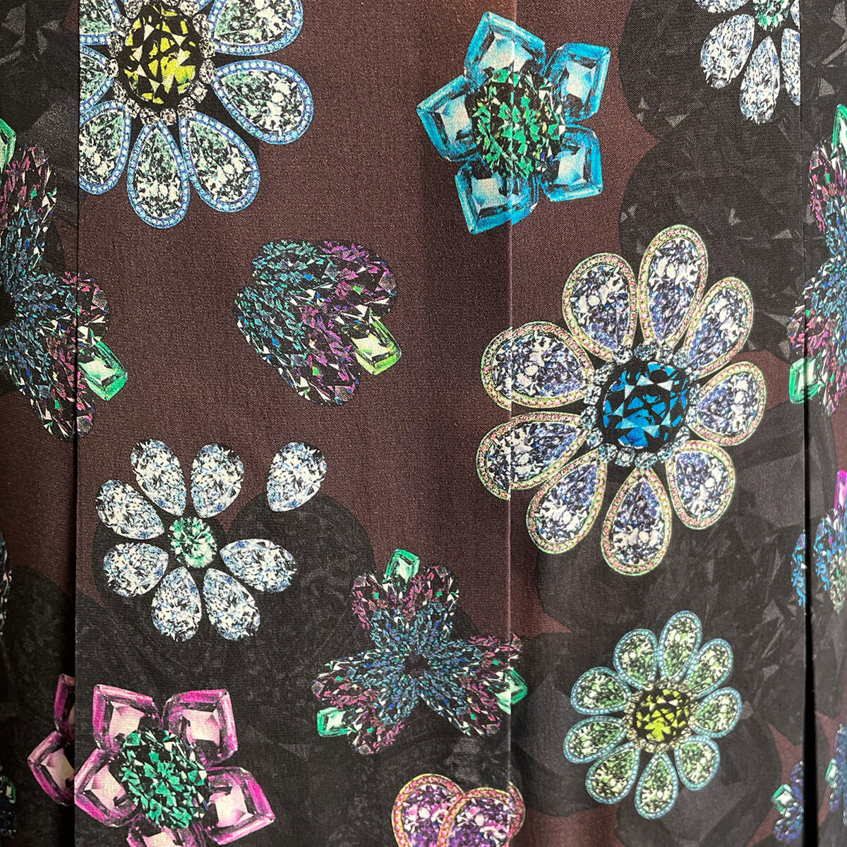 宝石を散りばめたようなプリントの、極上のシルクストレッチ生地。
