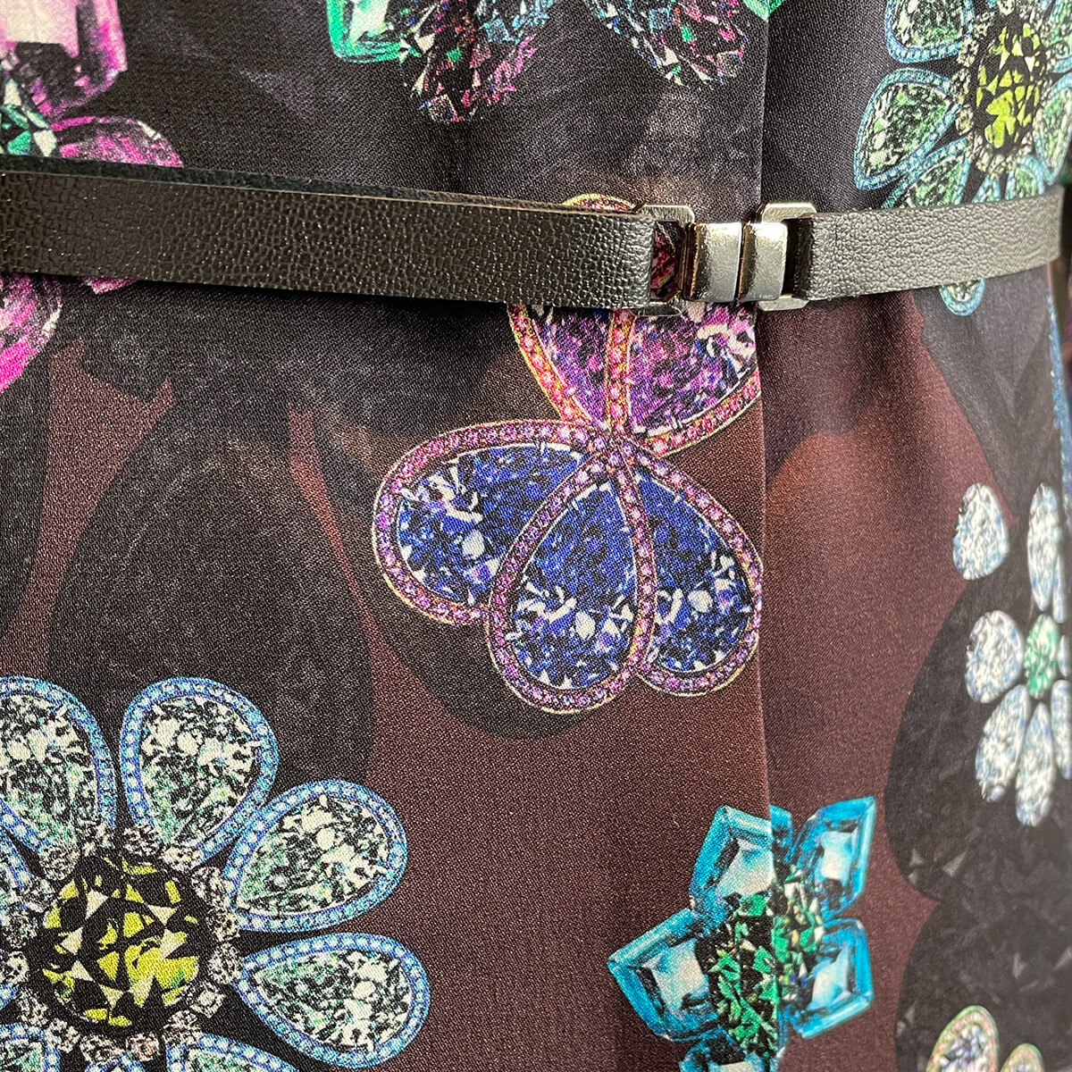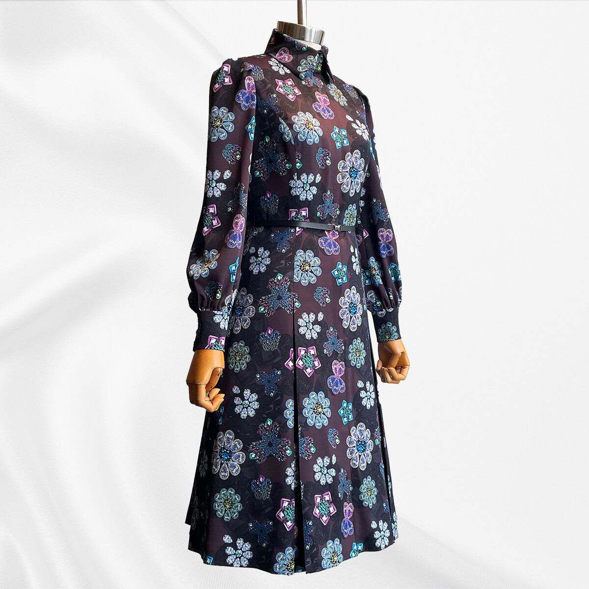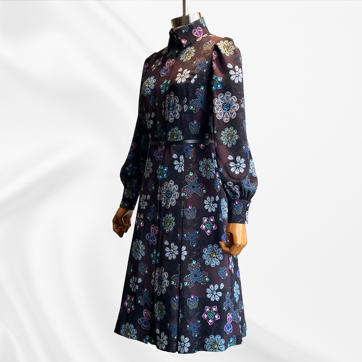 宝石を散りばめたようなプリントの、極上のシルクストレッチ生地。