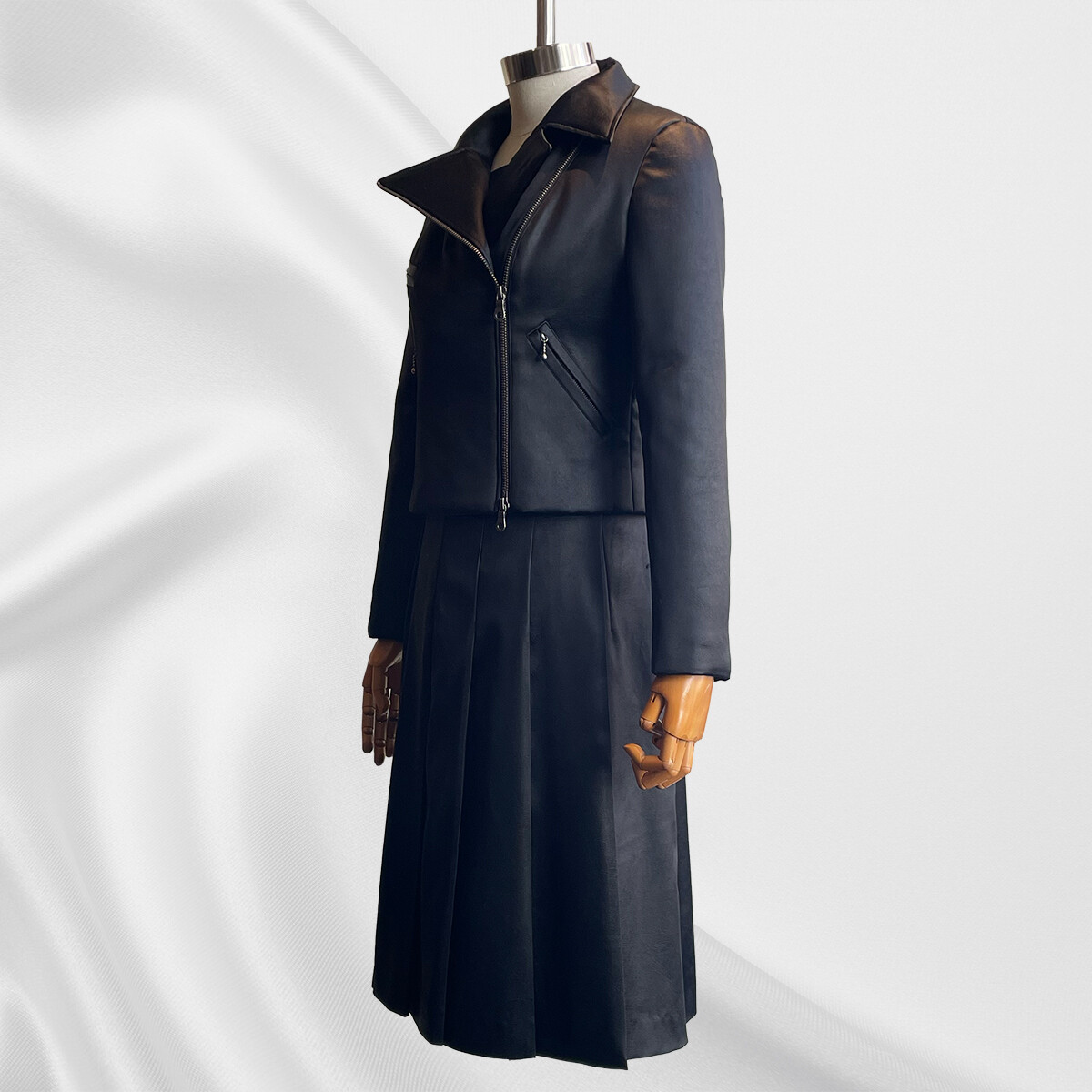 新作中綿入ライダースジャケット&プリーツ巻きスカートが完成しました。