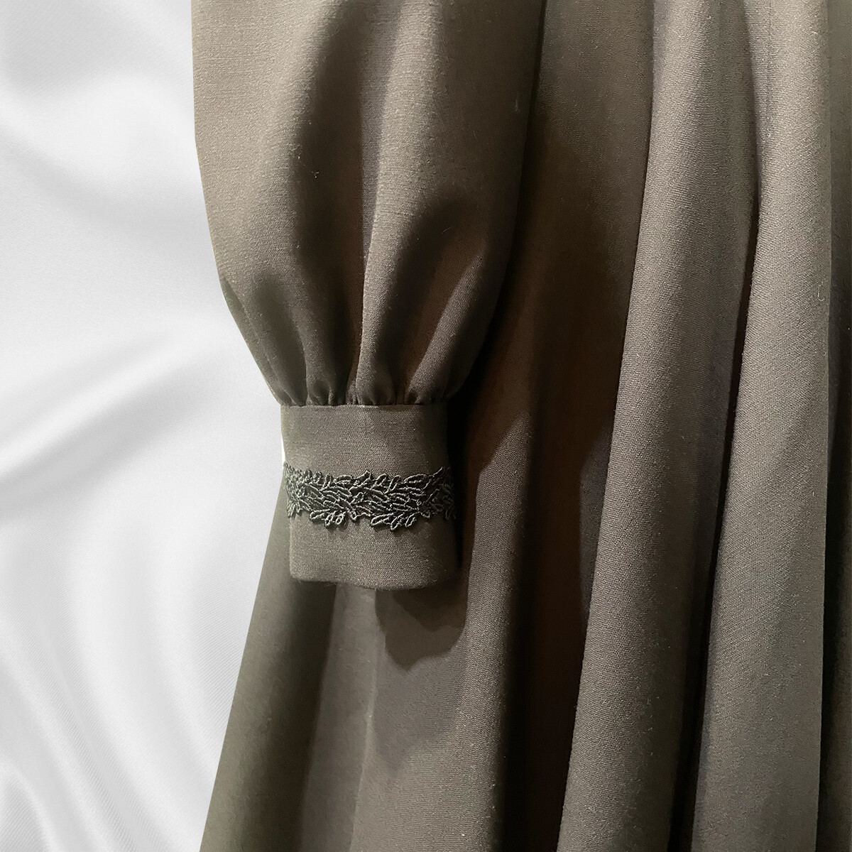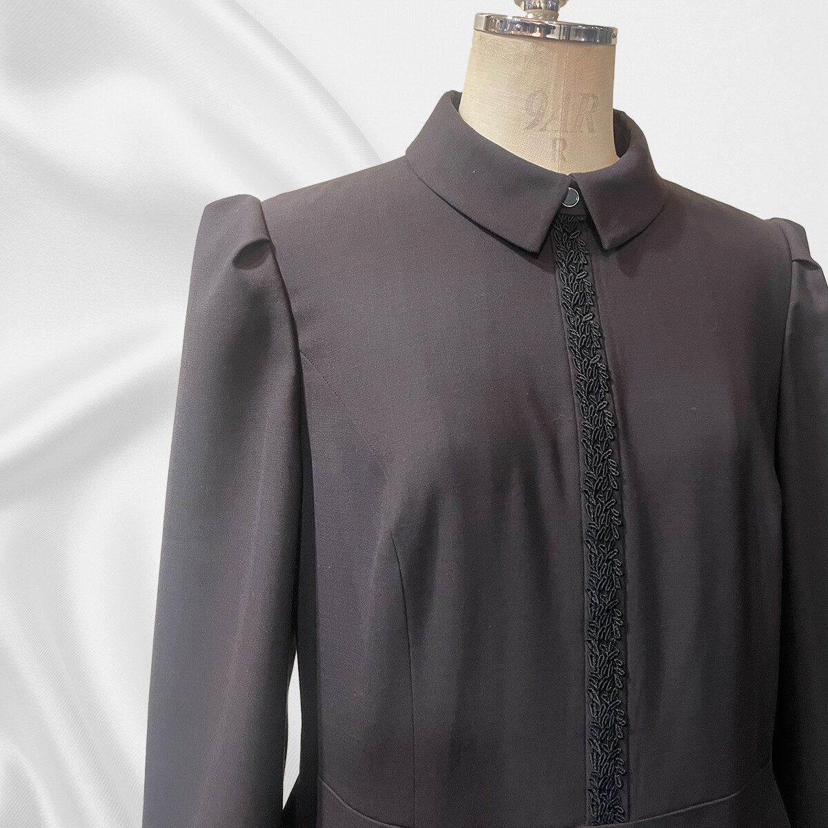黒いレースとダークブラウンのコントラストと、前開き風のデザインがとても上品な印象です。