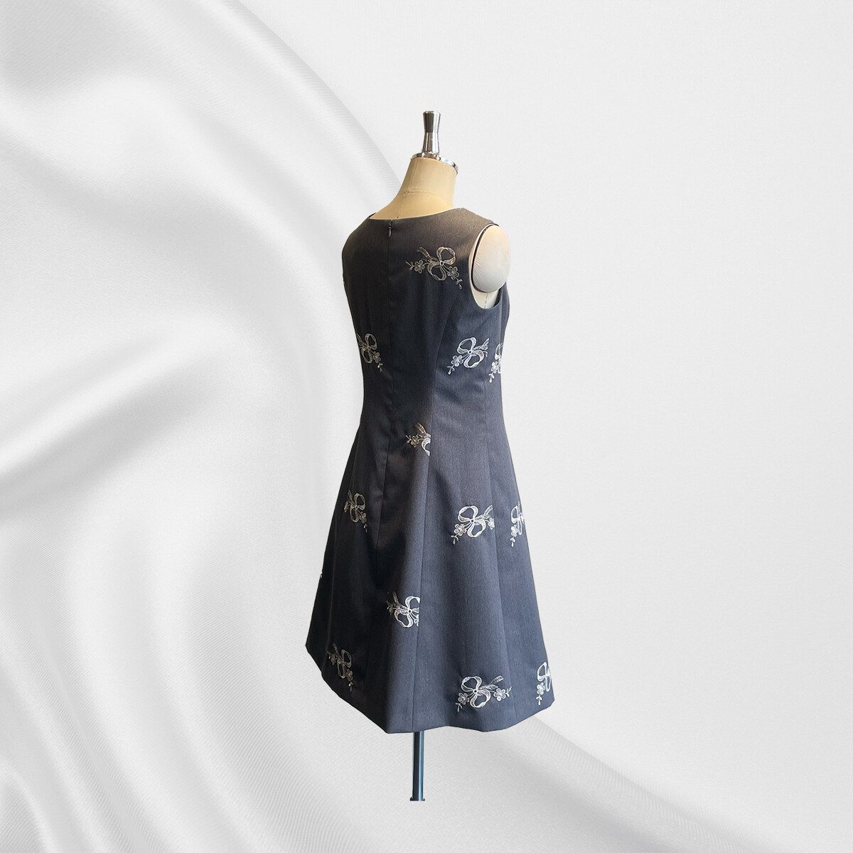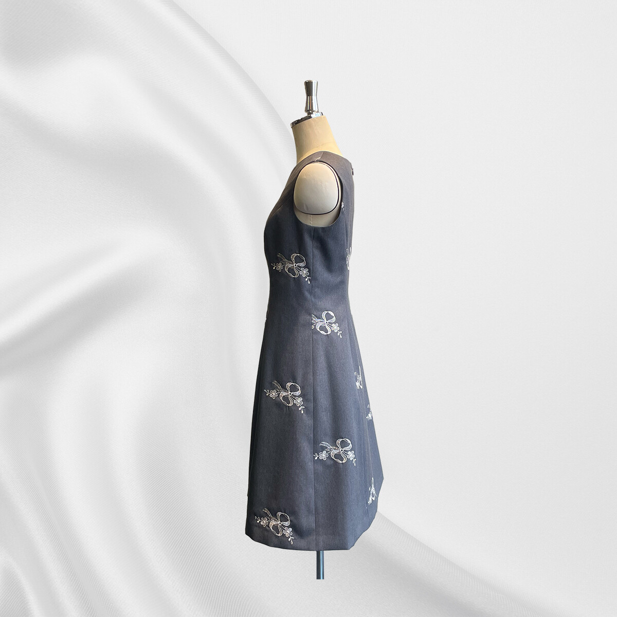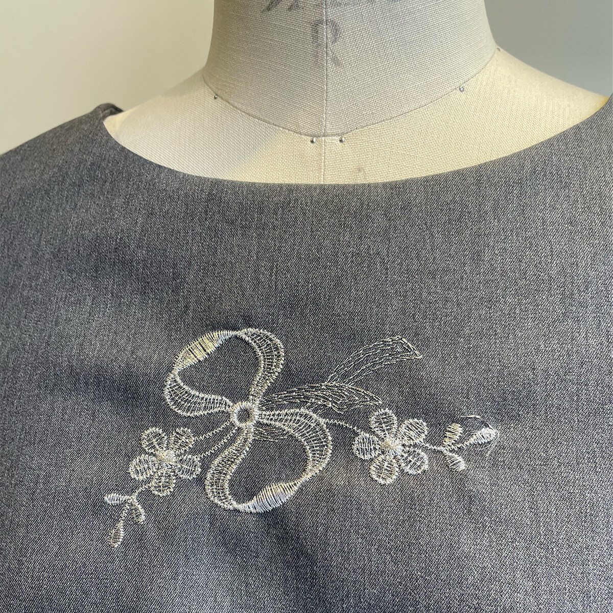 ウールにシルバーのラメ糸でリボン刺繡が施されたイタリア製の生地をお選び頂き、