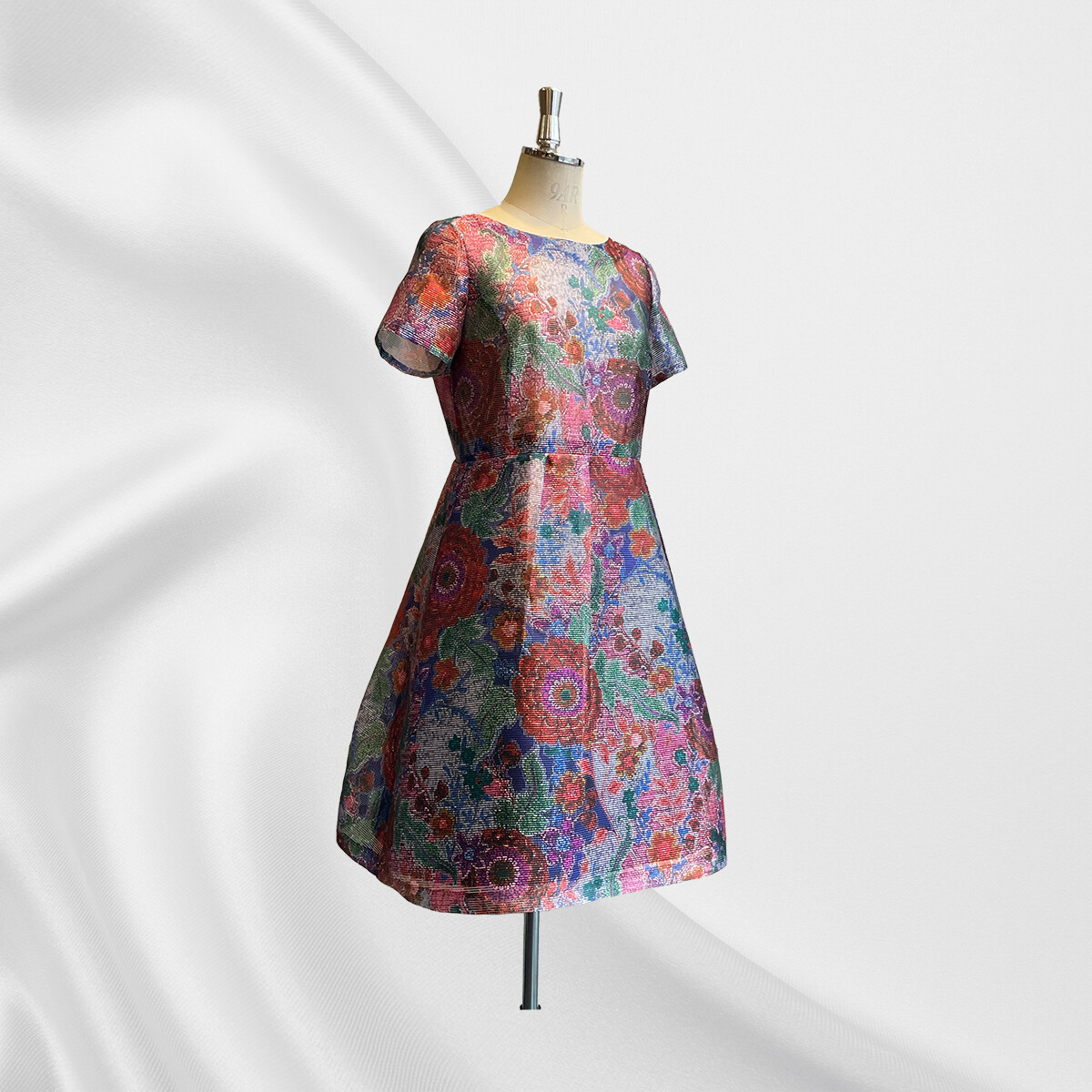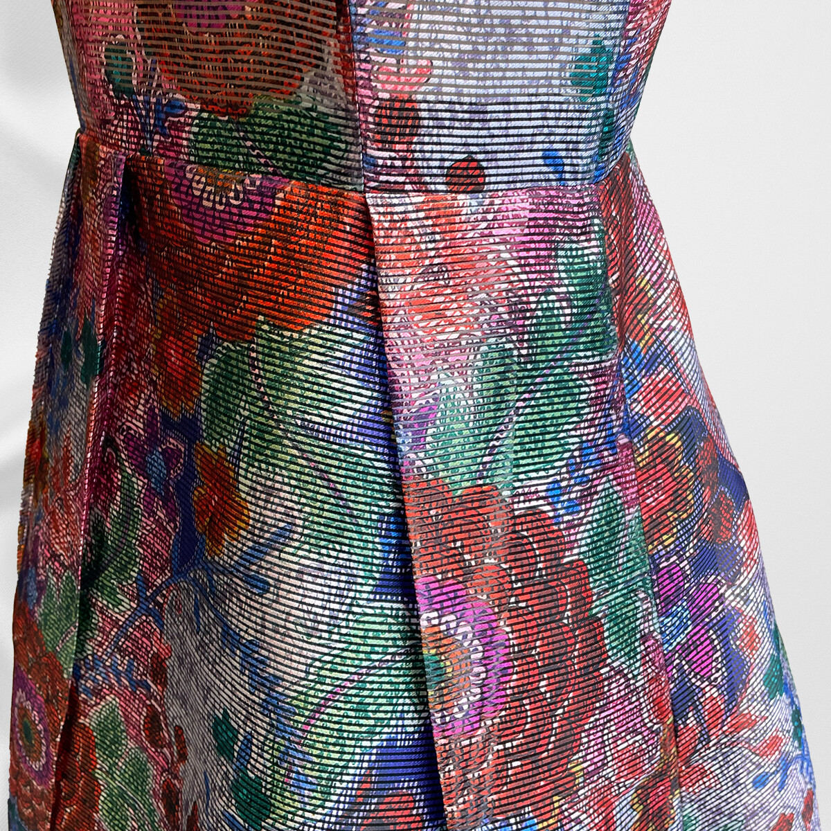 オーガンジーと白糸で織った生地に白地側にプリントを施し、
