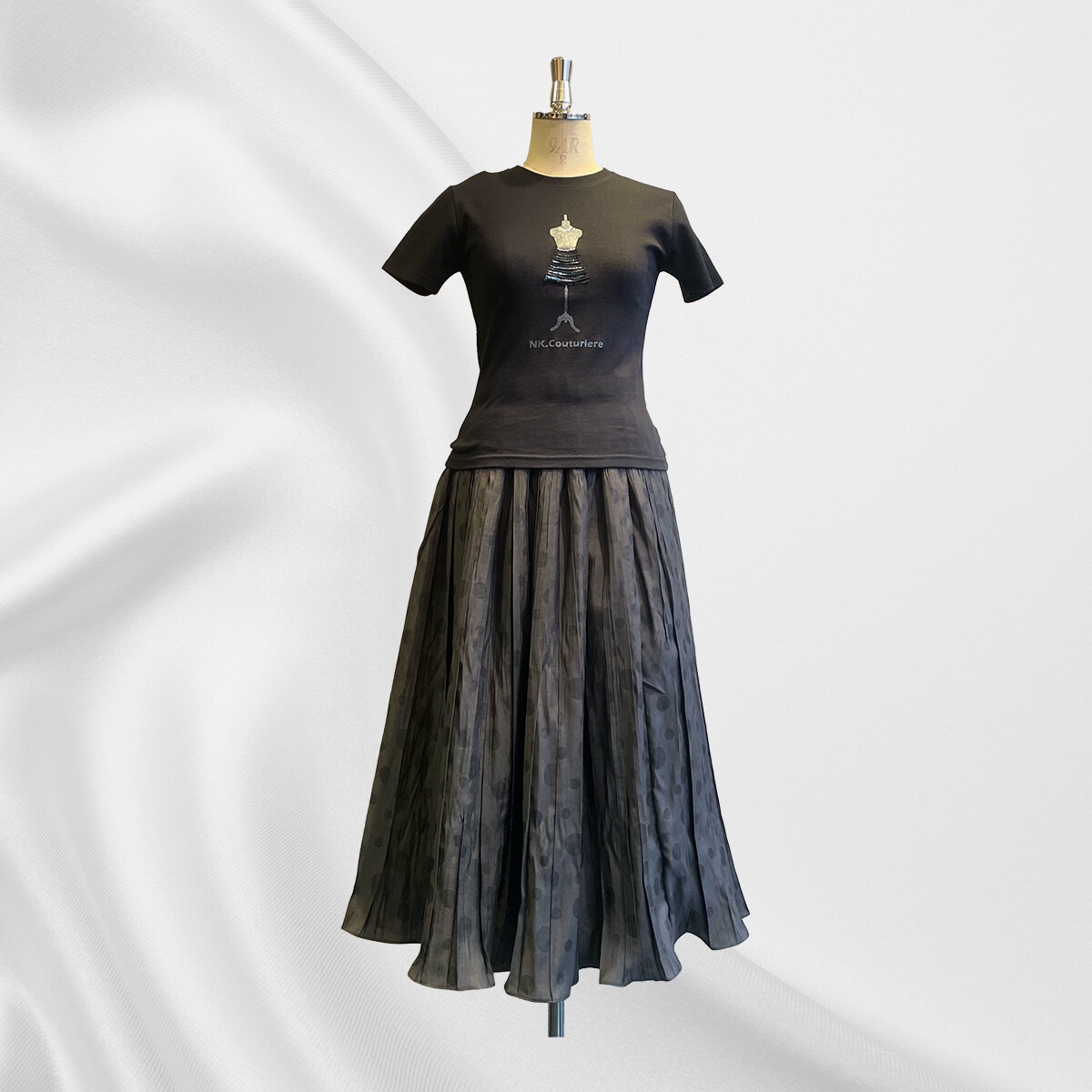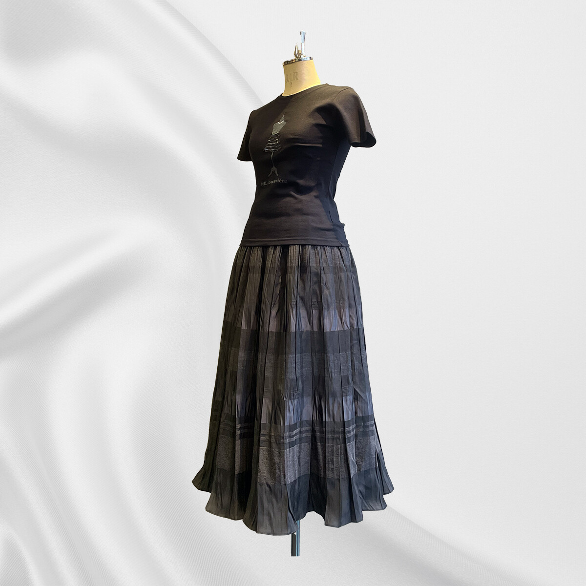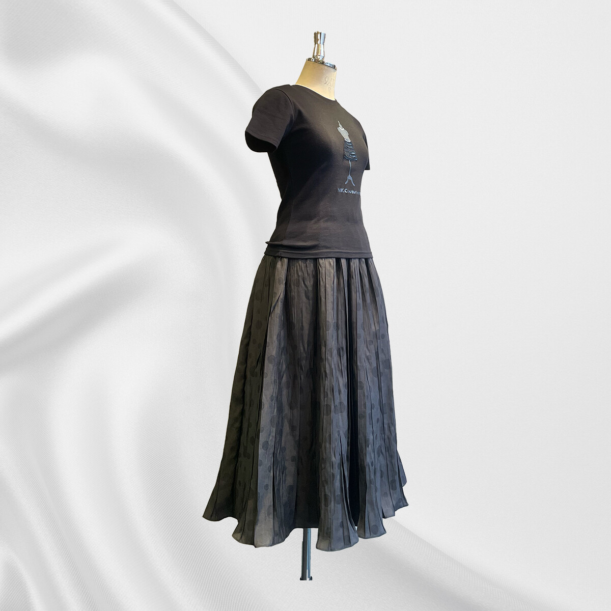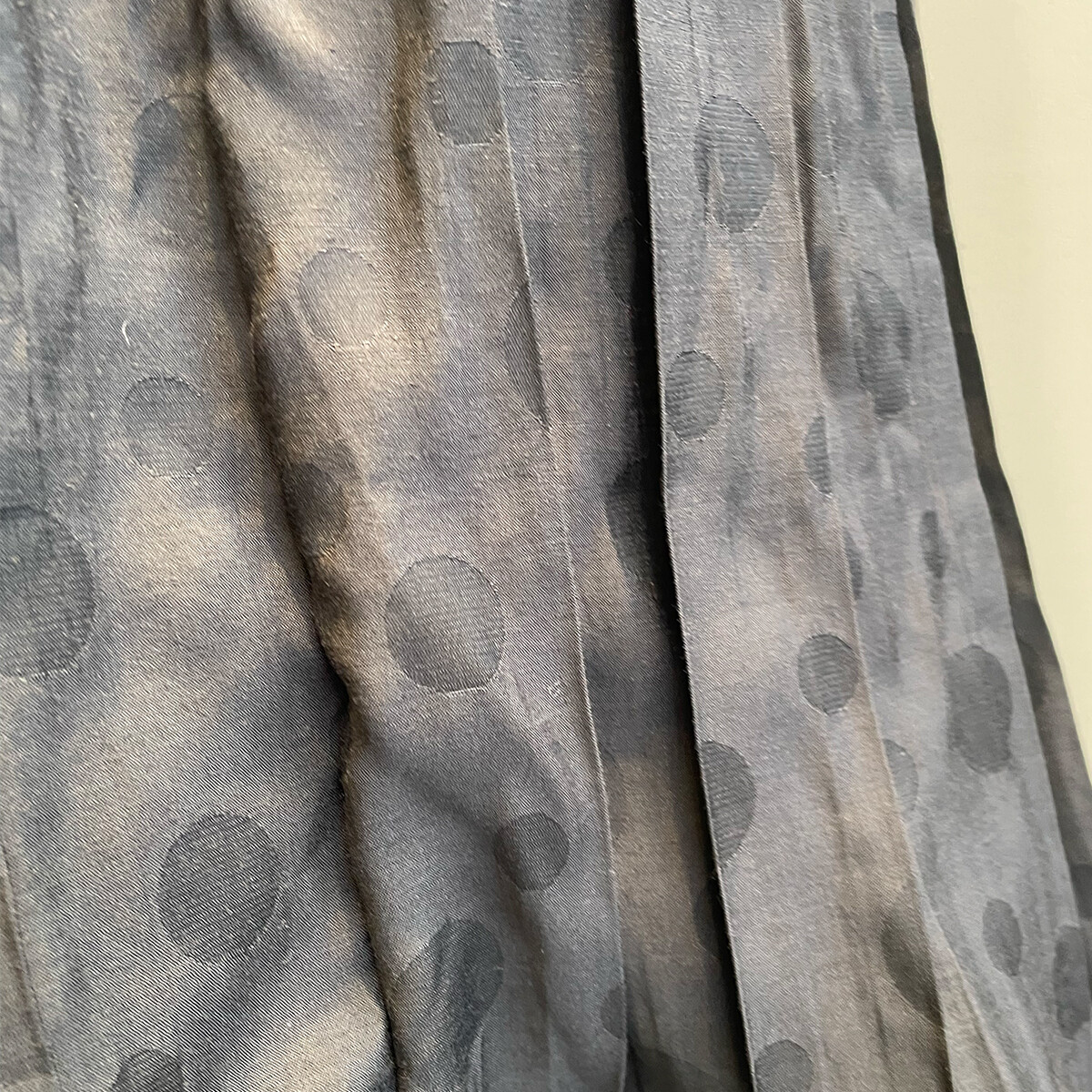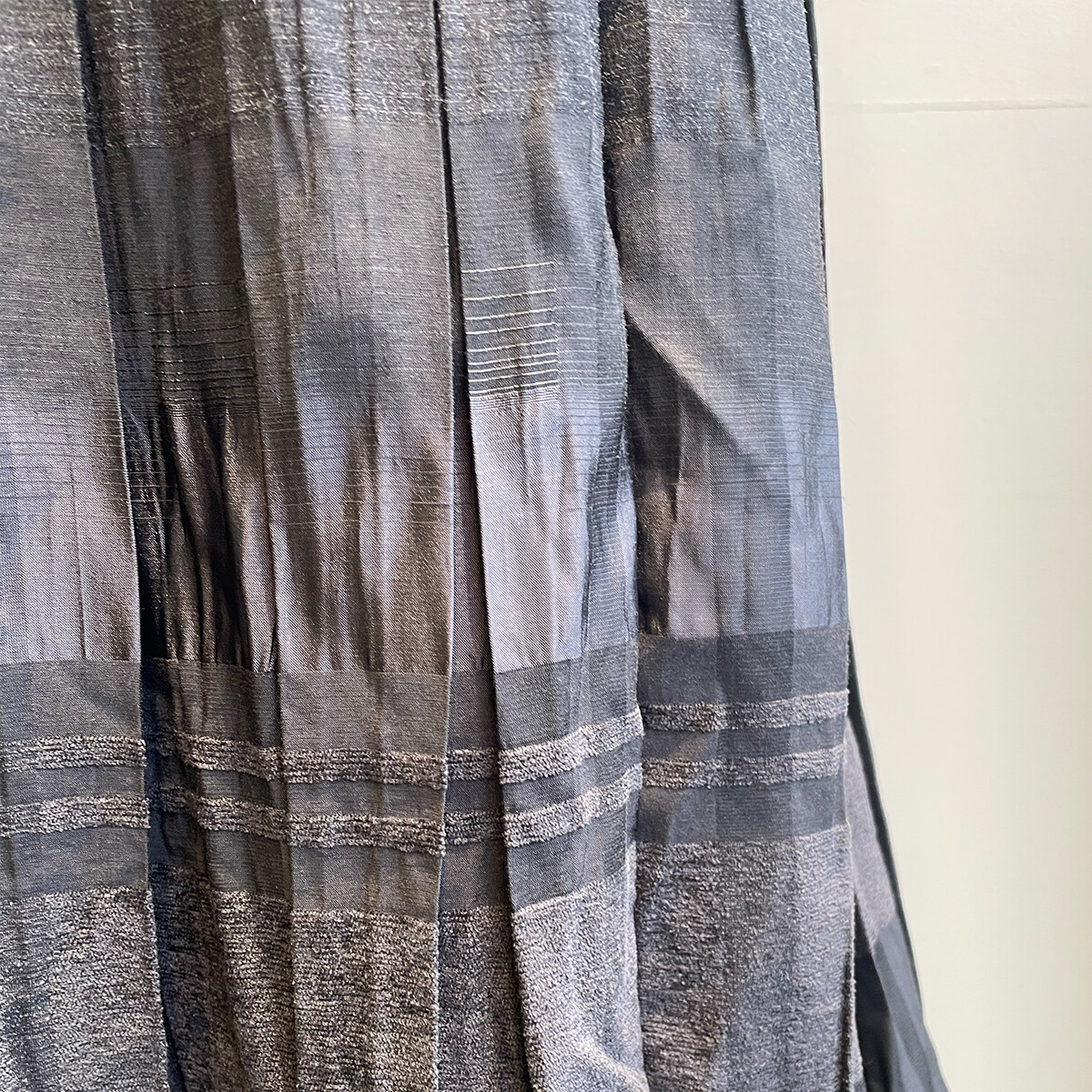 プリーツ加工にシャーリングされた生地を筒状に接いでから中心で折って