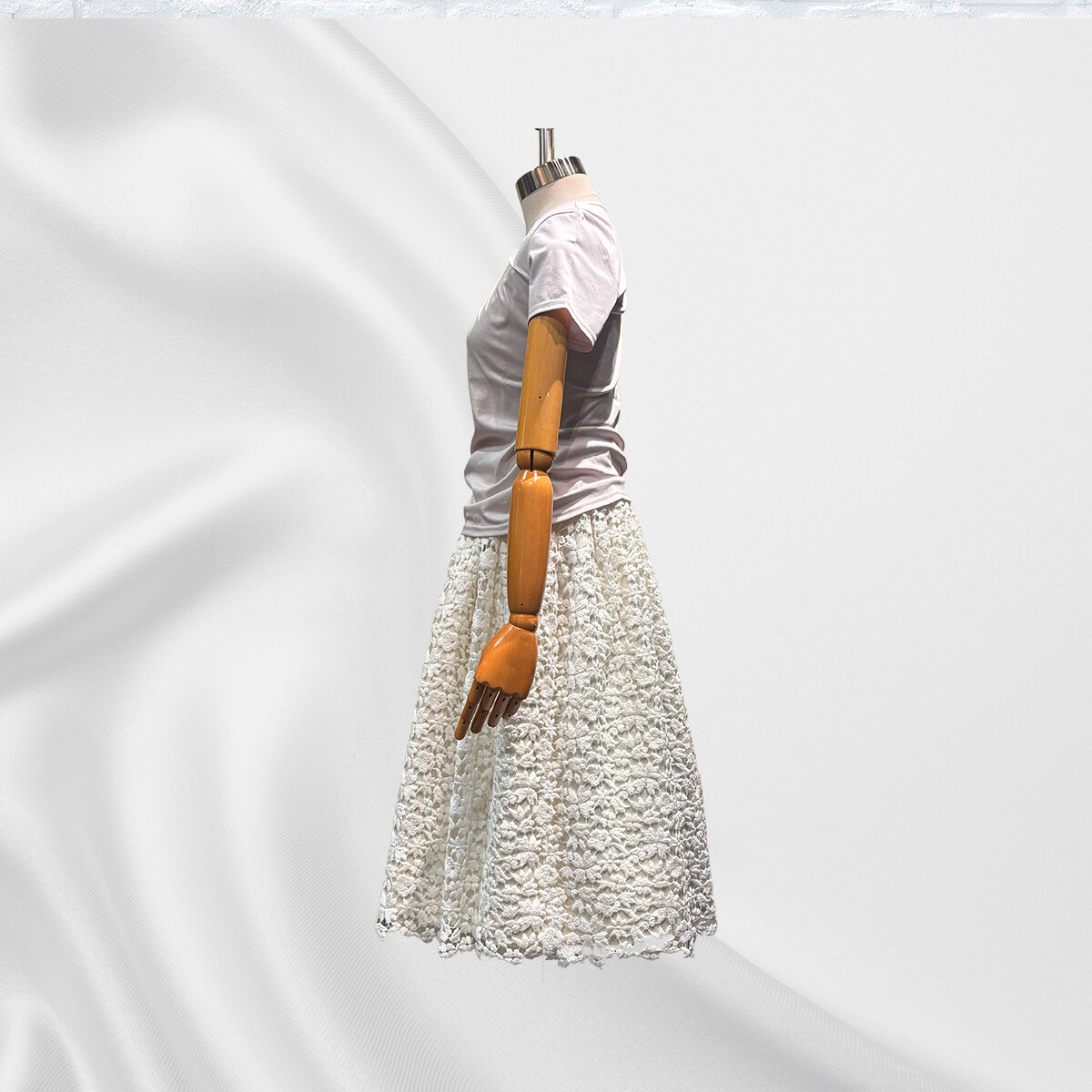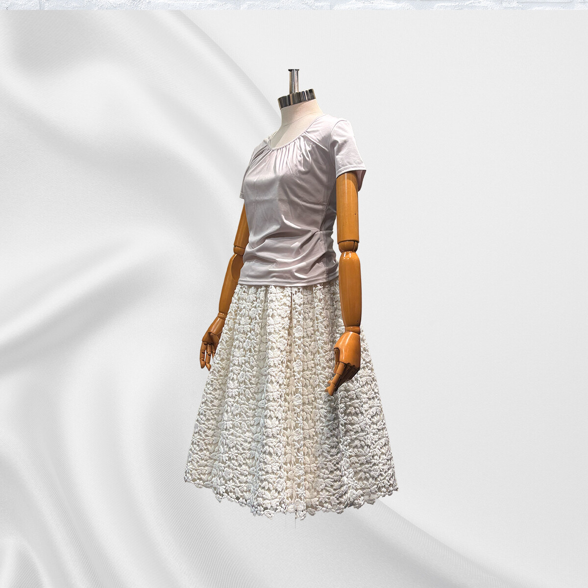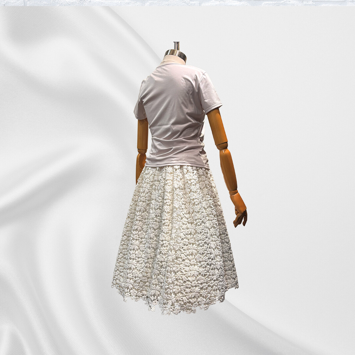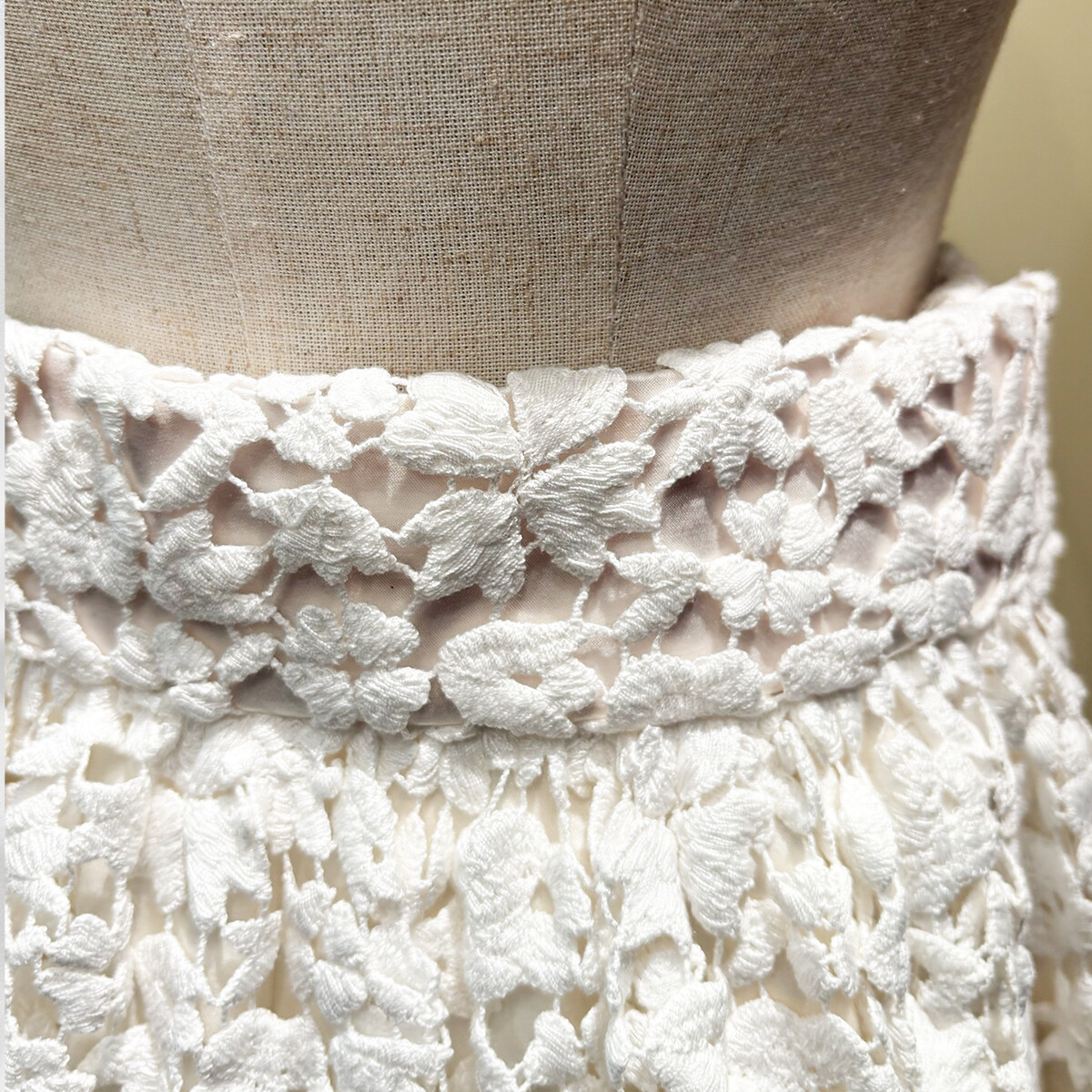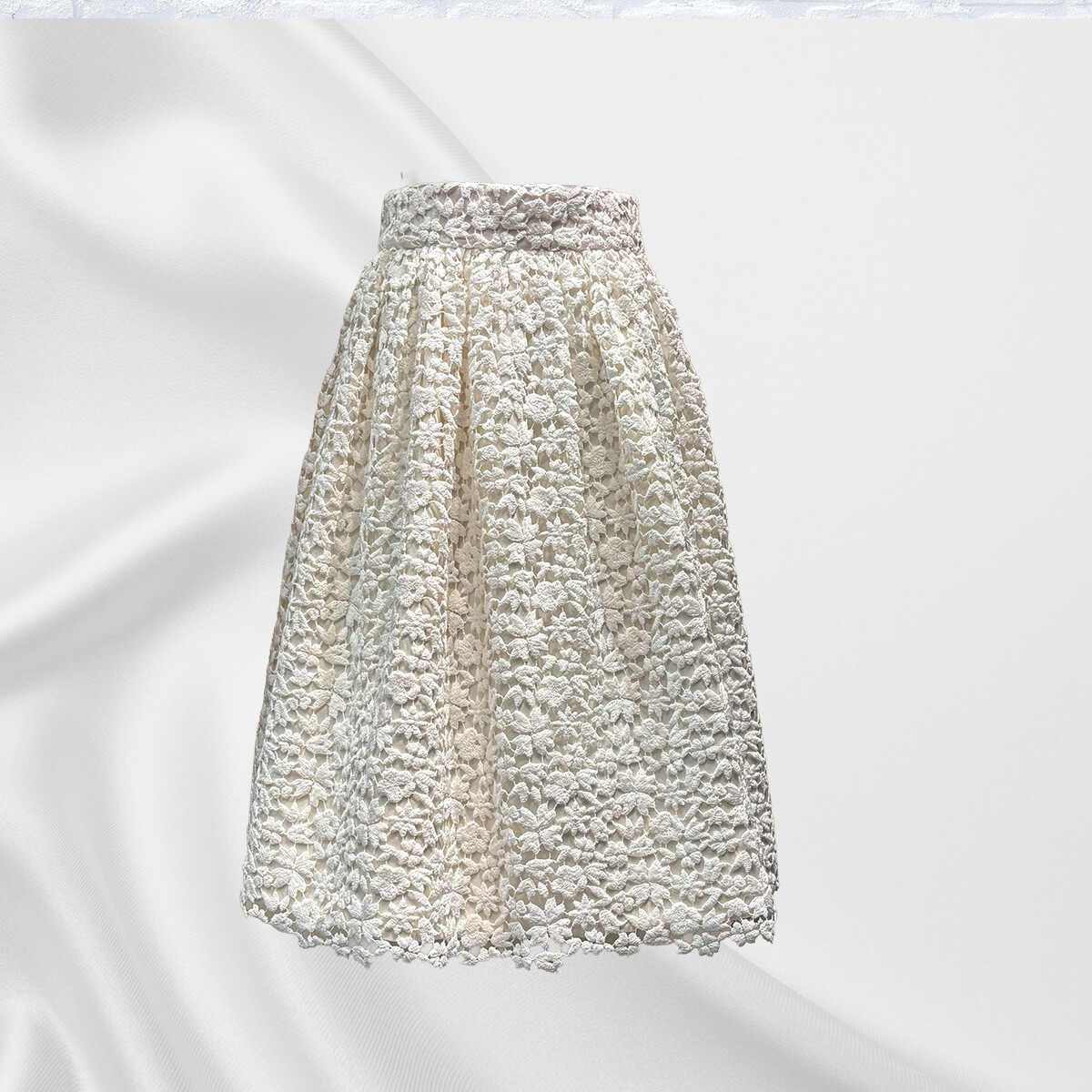 イタリア製の綿レースの重厚感に合わせて、内スカートには全面に芯地をはり、30個のダーツでスカートの形状を構築いたしました。ギャザーを寄せながらレースを抱かせてゴムベルトを付けております。内スカートには、光沢が美しいイタリア製の綿とシルクの生地を使用いたしました。ふんわりとしたラインをキープし、ブラウスと合わせてエレガントに、ライダースと合わせてかっこ可愛く、様々な場面で活躍する存在感のあるスカートです。