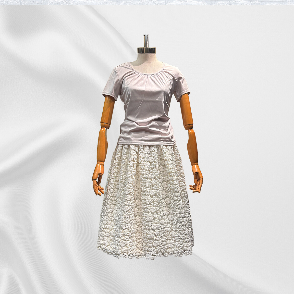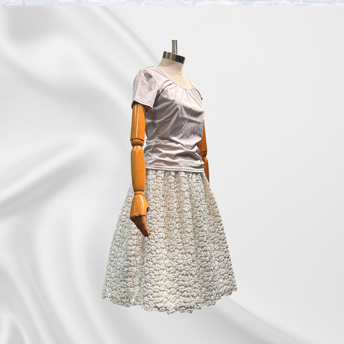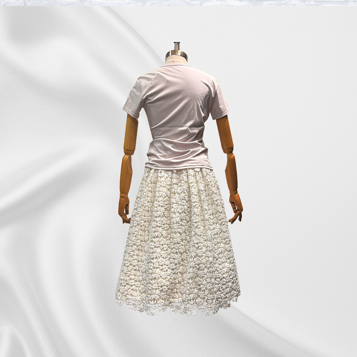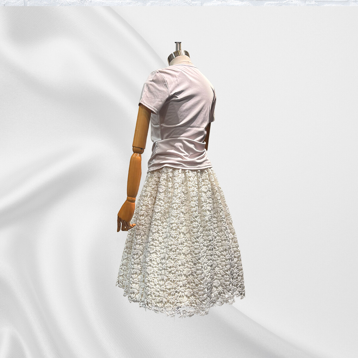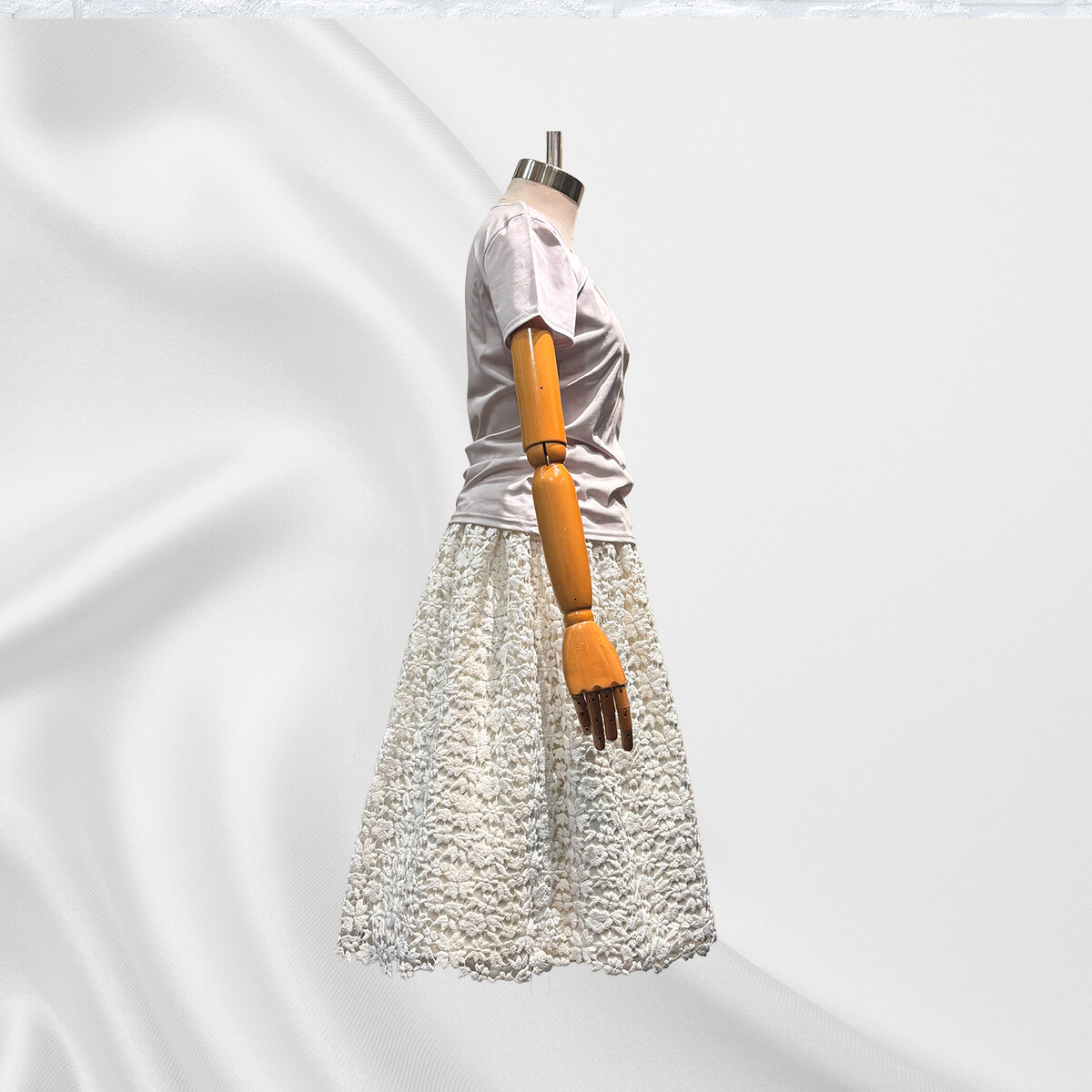 イタリア製の綿レースの重厚感に合わせて、内スカートには全面に芯地をはり、30個のダーツでスカートの形状を構築いたしました。ギャザーを寄せながらレースを抱かせてゴムベルトを付けております。内スカートには、光沢が美しいイタリア製の綿とシルクの生地を使用いたしました。ふんわりとしたラインをキープし、ブラウスと合わせてエレガントに、ライダースと合わせてかっこ可愛く、様々な場面で活躍する存在感のあるスカートです。