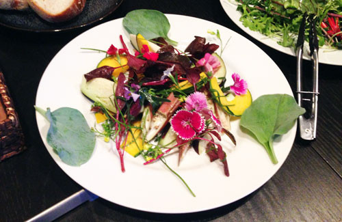 写真のお皿の3枚の葉っぱは、牡蠣の味がする 「オイスターリーフ」です。