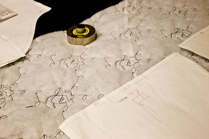 MASHA(マシャ) / Naoko.Komatsu Couturiere (クチュリエール) デザイナーのKomatsu です。今日は、新作の中綿入り リバーシブル ブルゾンを再制作、裁断中。